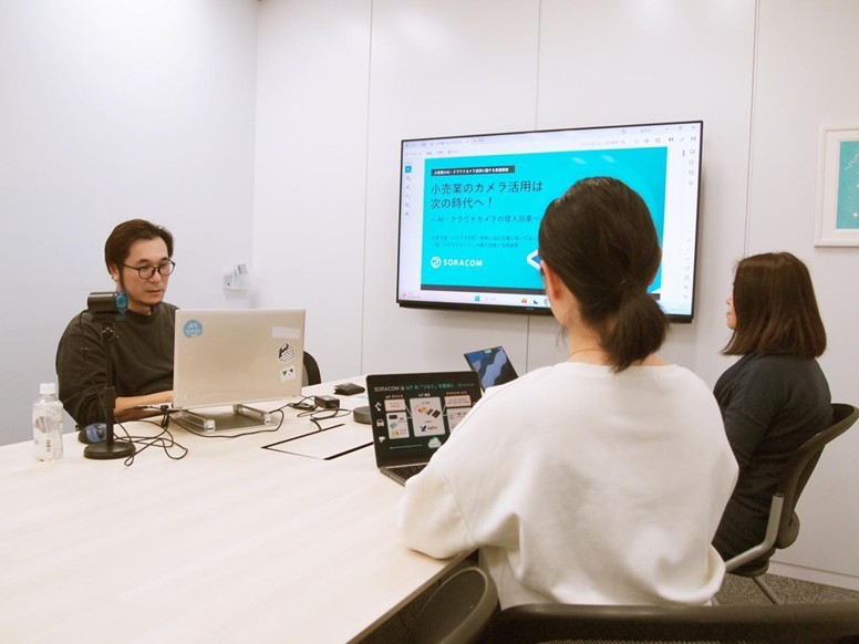 株式会社ソラコム マーケティング担当の尾崎氏(右奥)、田渕氏(右手前とFM代表の峯林(左)とのミーティング風景。