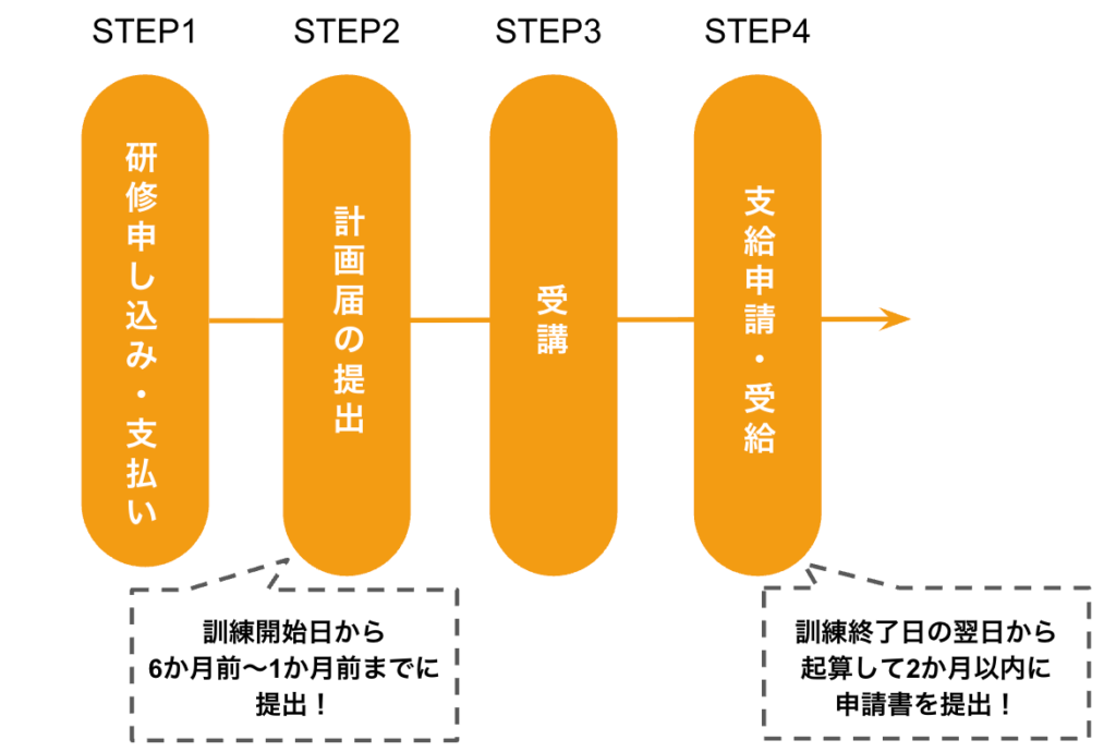 なお、支給申請は、研修受講後に行う点に注意が必要です。計画届の提出(STEP2)の時点では支給申請は行われないため、「支給申請書」を忘れずに用意しておきましょう。